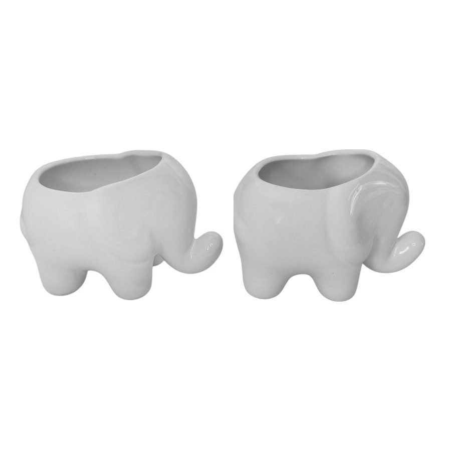 Transforma tu espacio con este encantador juego de macetas de cerámica en forma de elefante blanco con la trompa hacia arriba, símbolo de buena suerte, abundancia y protección.