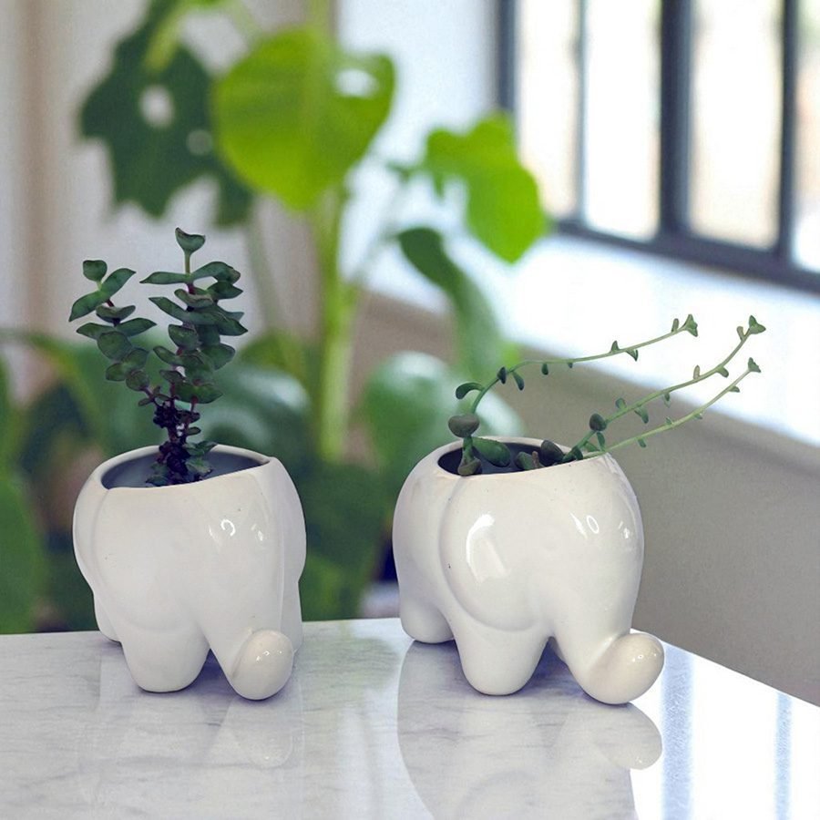 Decora con estilo y buena energía. Estas macetas blancas para suculentas combinan elegancia y significado. Trompa hacia arriba, símbolo de abundancia. Medidas: 9.5x9x13 cm.