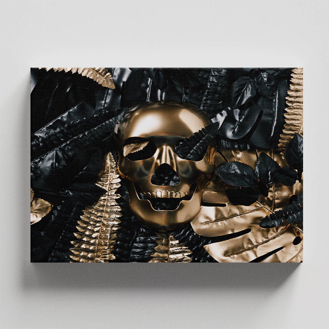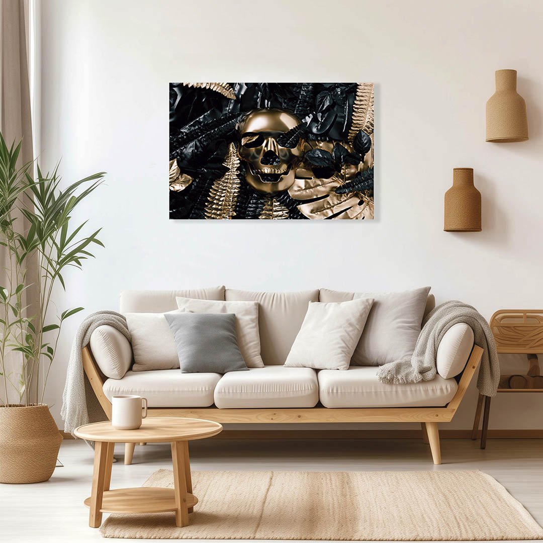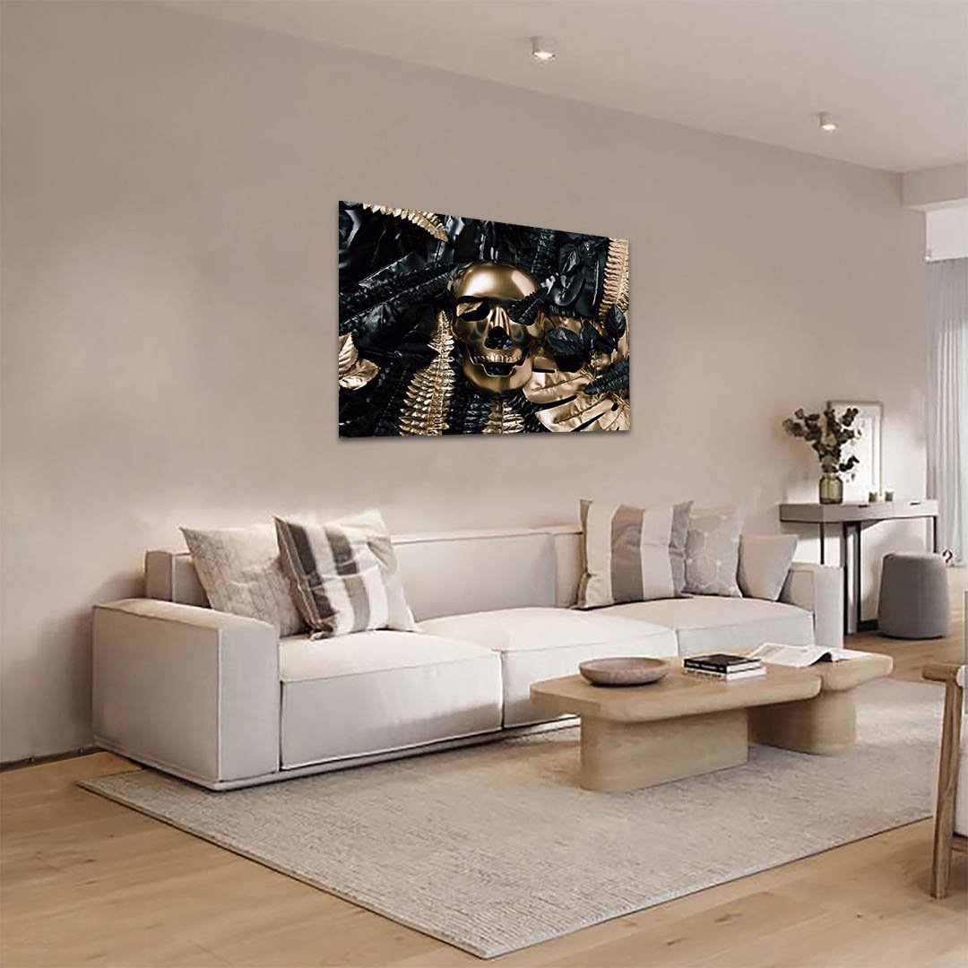 Cuadro Decorativo Calavera y hojas en Dorado y Negro