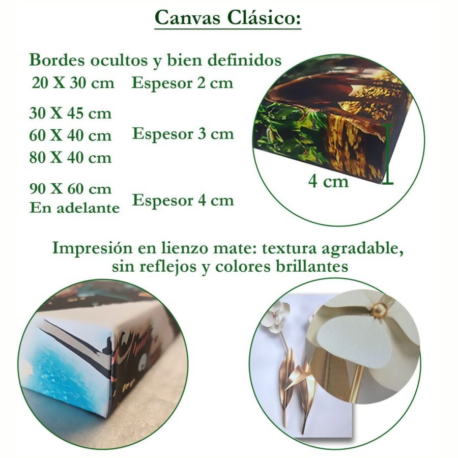 • Canvas: Bastidor fabricado en madera de pino de 1ra reforzado y ranura para colgado seguro