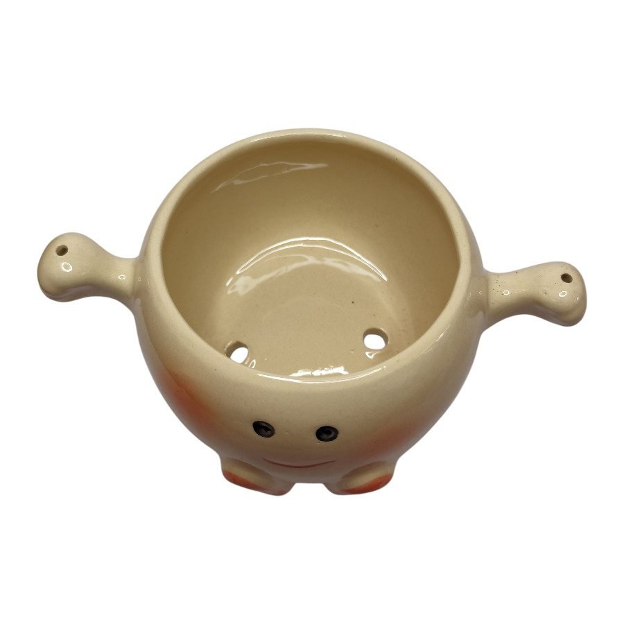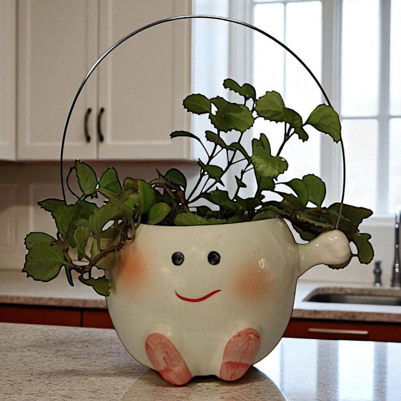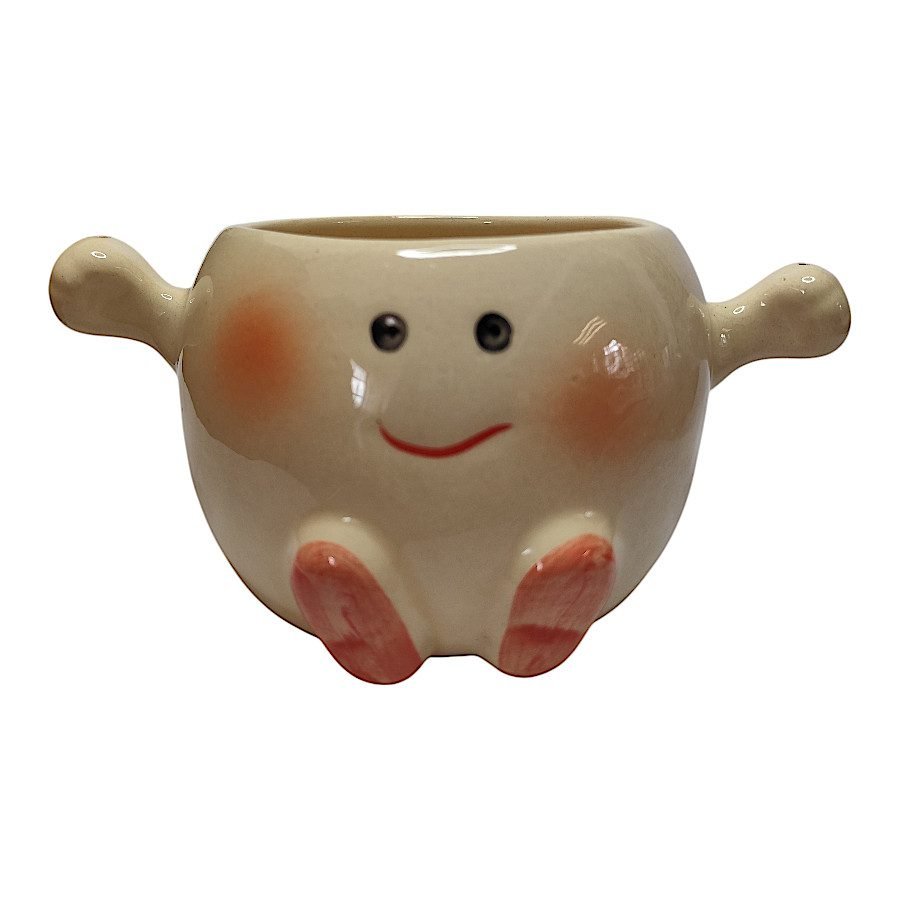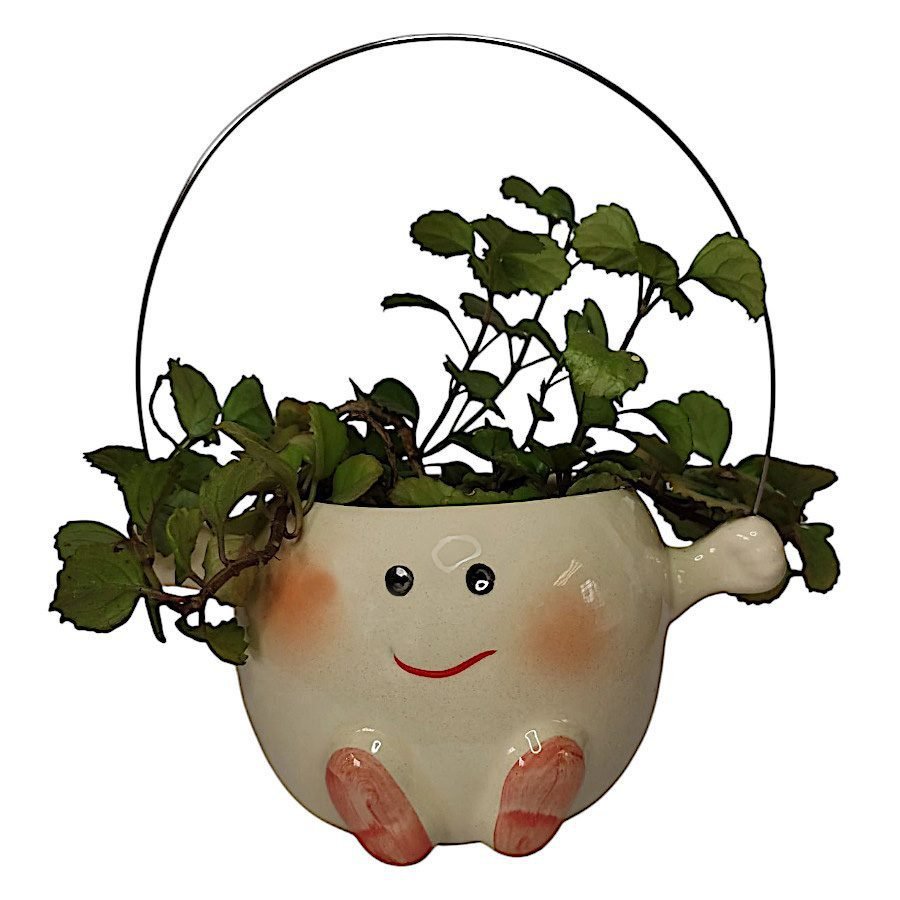 Esta maceta de cerámica con carita sonriente, mejillas rosadas y pies pintados es perfecta para plantas pequeñas o suculentas. Su diseño encantador y el asa metálica la hacen ideal para colgar o colocar sobre repisas, escritorios o habitaciones infantiles.