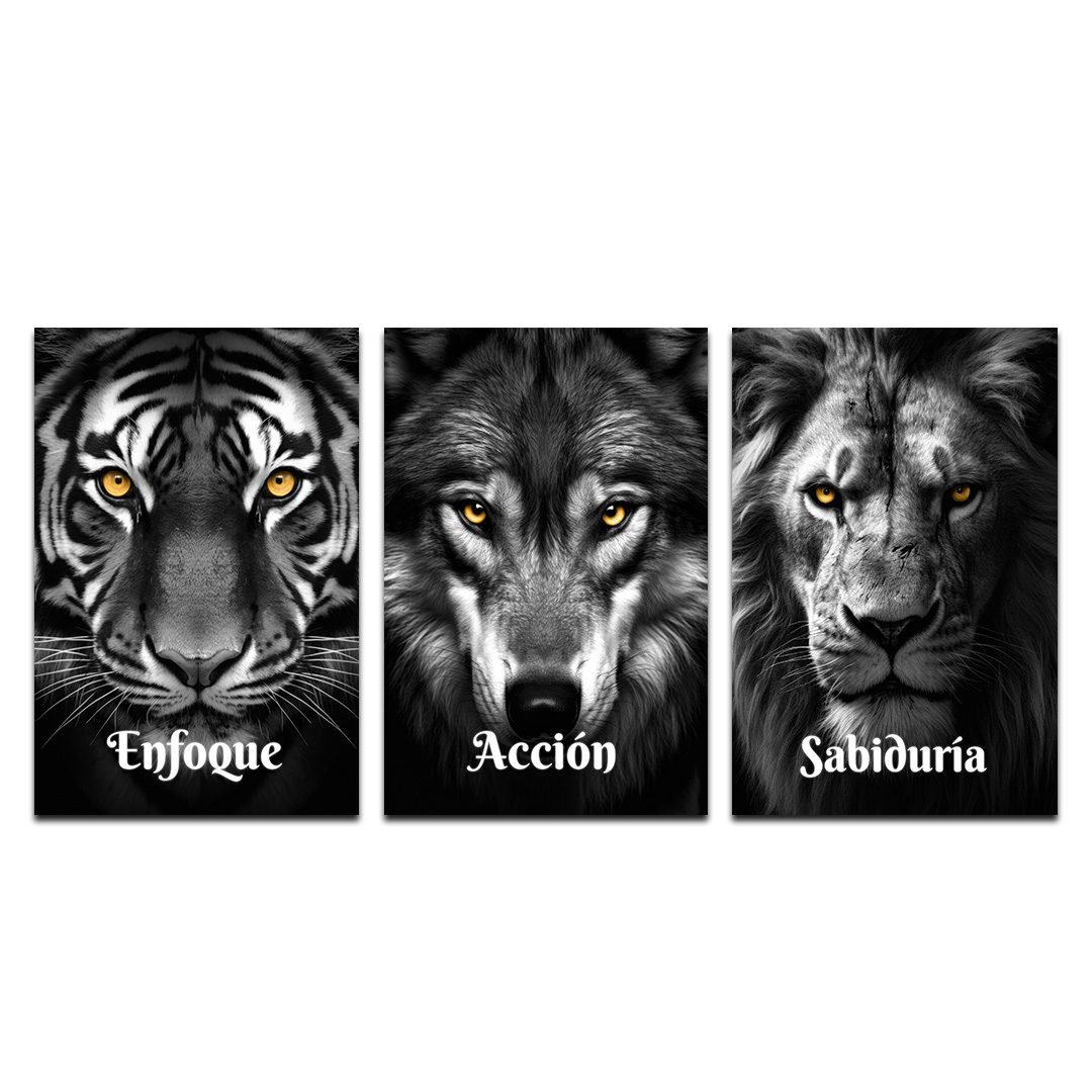 Set de 3 Cuadros Decorativos León, Tigre y Lobo – Sabiduría, Enfoque y Acción