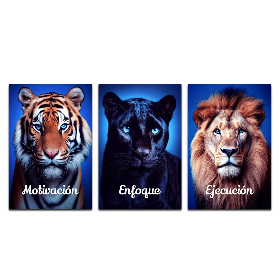 Set de 3 Cuadros Decorativos Tigre, León y Pantera – Motivación, Enfoque, Ejecución